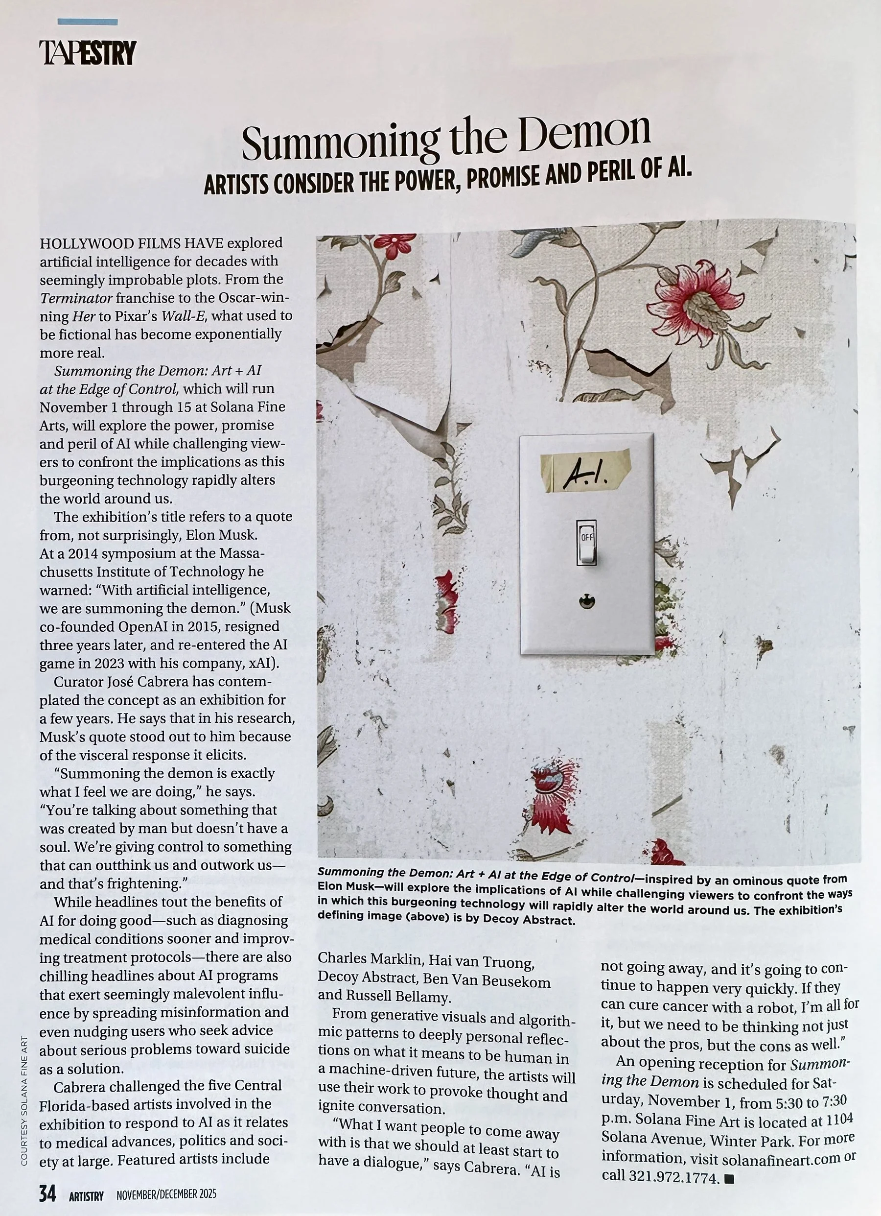 ArtistryNovember | December 2025See artwork up close Publications Decoy Abstract Interior AppealFall 2025See artwork up closeSee publication Orlando ArtsNovember | December 2021See Artwork up close